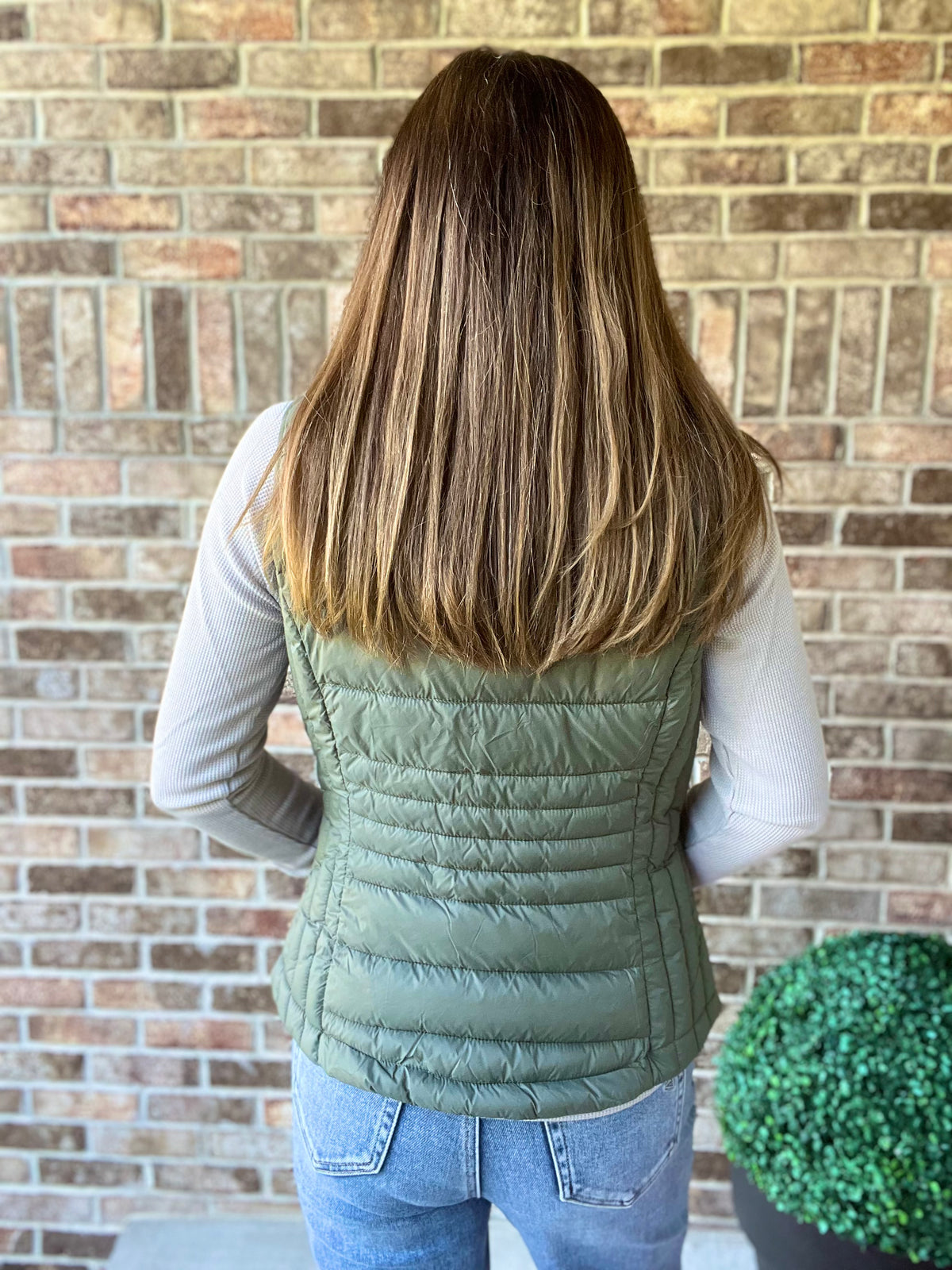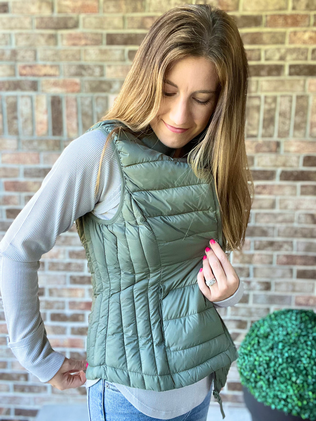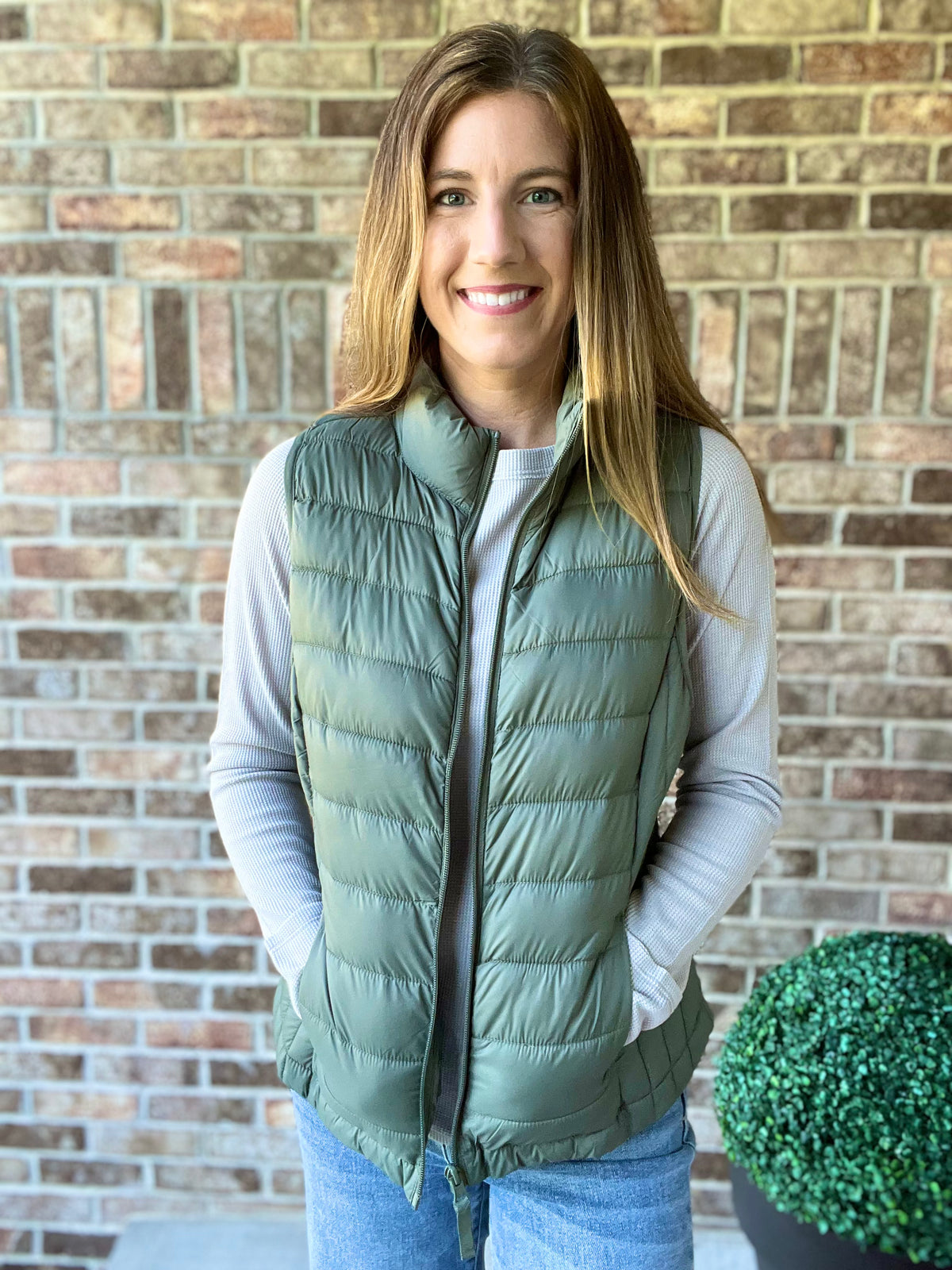 Designed with a seam to create a slim and fitted cut, this evergreen thermal vest is lightly padded with a stand up collar, zip at front, and two side pockets.