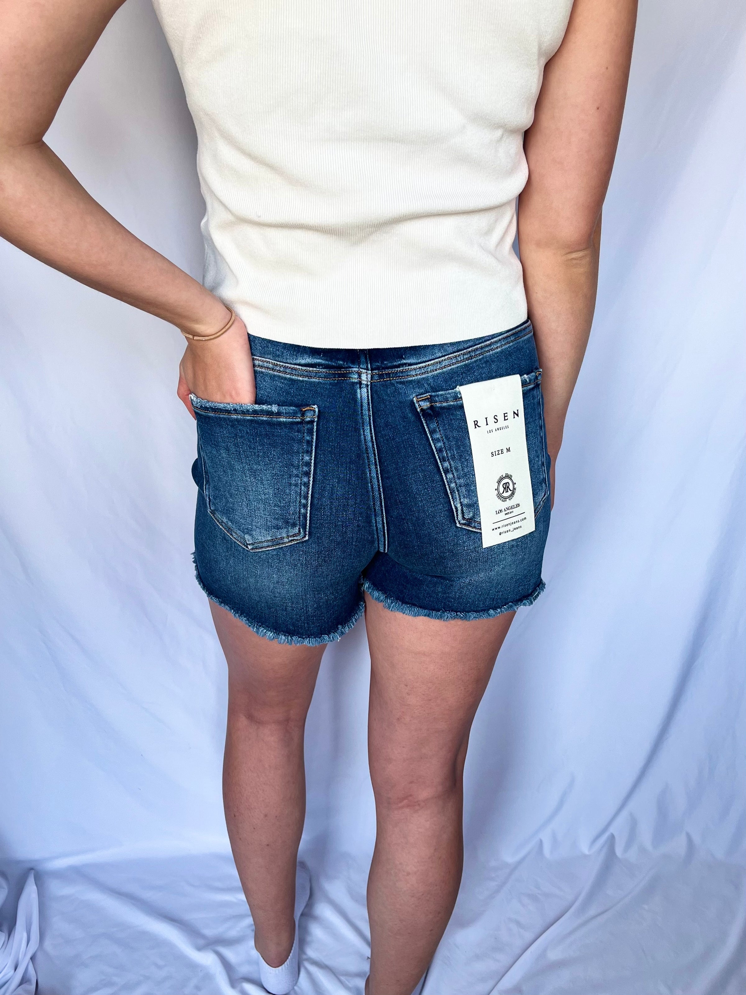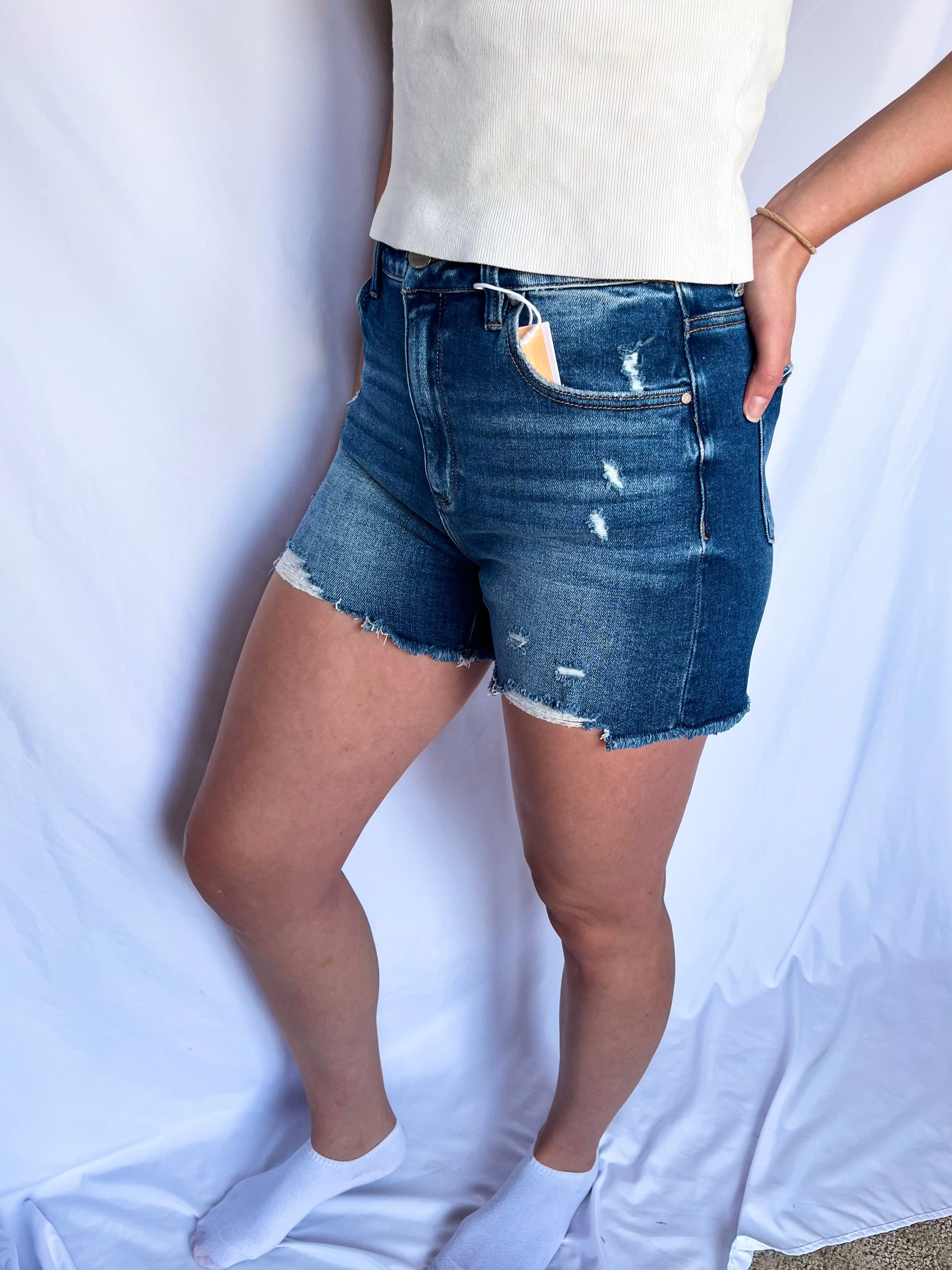 These dark wash jeans provide excellent length without the mid-thigh length label. True to size and comfortable for all day wear, they're the only dark wash pair of jean shorts you'll need!