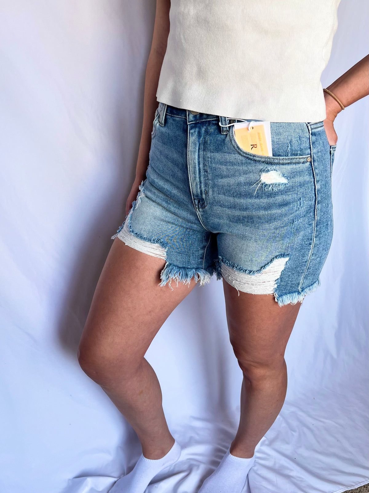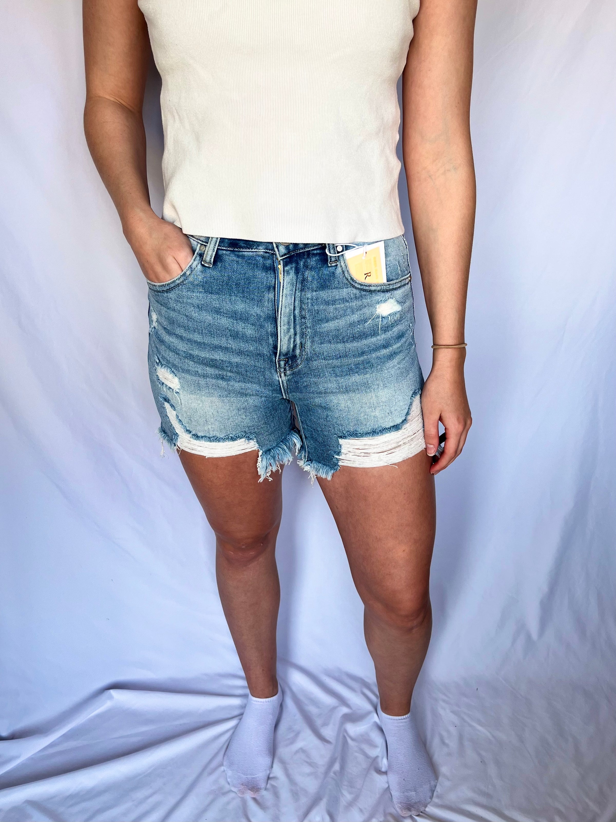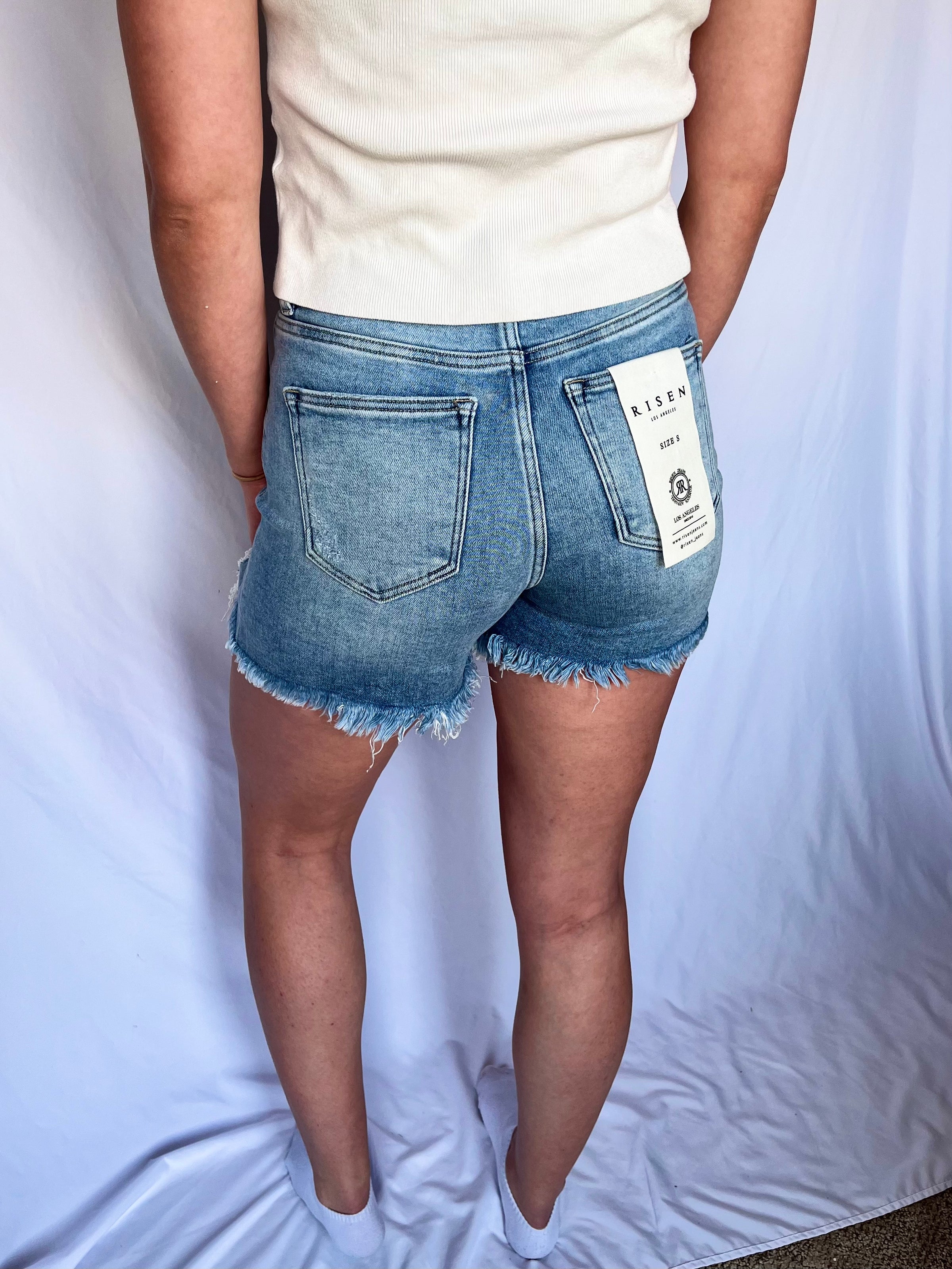 Our mom approved, high rise, light washed, mid-thigh length shorts provide that extra comfort to make you feel confident all day long!
